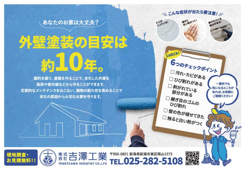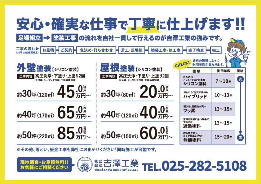 新潟県新潟市に拠点を構える(株)吉澤工業は、外壁塗装・屋根塗装工事をを手がける会社です。私たちは、足場の設置から塗装工事まで一貫して行うことで、安心して工事を任せることができるサービスを提供していきます。